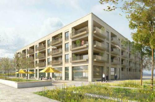 Es verfügt über 57 Wohneinheiten , davon 17 mietpreisgebundene, geförderte Wohnungen, 3 Gewerbeeinheiten, sowie 74 Tiefgaragenstellplätze.