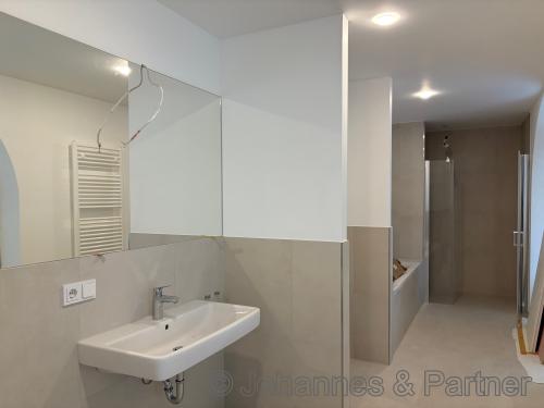 * modern und hell geflieste Bäder mit ebenerdigen Duschen und/oder Badewanne