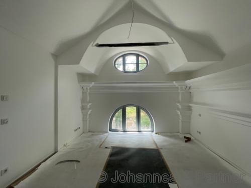 * teilweise aufwendige Vertäfelungen, historische Gesimse und Stuck