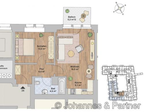 Im Herzen von Striesen-Ost, einer der gefragtesten Wohngegenden von Dresden befindet sich im denkmalgeschützten Gebäude der Historischen Tabakfabrik diese 2-Raum- Wohnung. Die Außenanlagen werden zeitgemäß und freundlich angelegt, mit Spielplatz und Sitzgelegenheiten und fügen sich harmonisch in das Gesamtbild ein. Baujahr:1912/ 2019 Objektzustand: gepflegt Die Wohnungen gleichen im Wesentlichen dem Grundriss der hier abgebildeten Ansicht! Der Grundriss ist nicht maßstabsgetreu, die Raumgrößen sind beispielhaft u. können geringfügig variieren. Die Wohnung kann spiegelverkehrt sein. Die abgebildete Möblierung stellt lediglich einen Vorschlag dar und ist nicht Leistungsbestandteil.