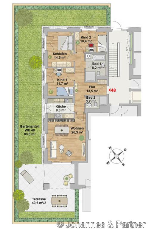 * im Erdgeschoss Terrasse und eigenem Gartenanteil